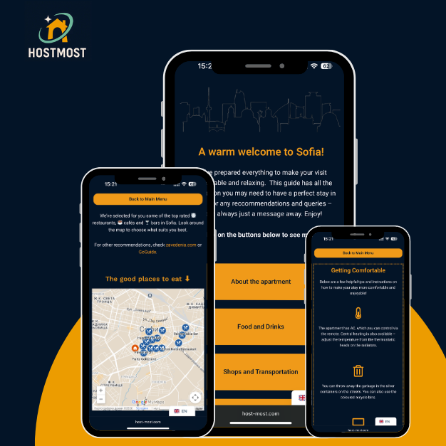 At HostMost, we act as the bridge between hosts and guests — helping your property stand out in a crowded market through clear communication, beautiful presentation, and a personal touch. This is why we came up with the platform for guests, that help them feel like at home. They receive all the useful information they need, you receive effortless hosting!
